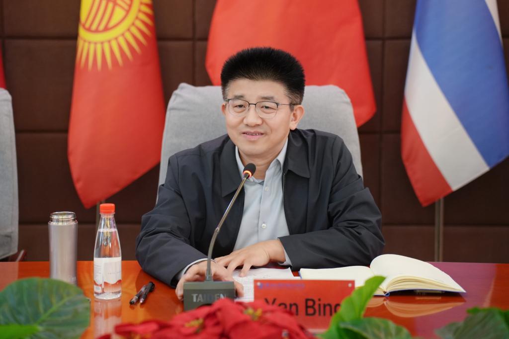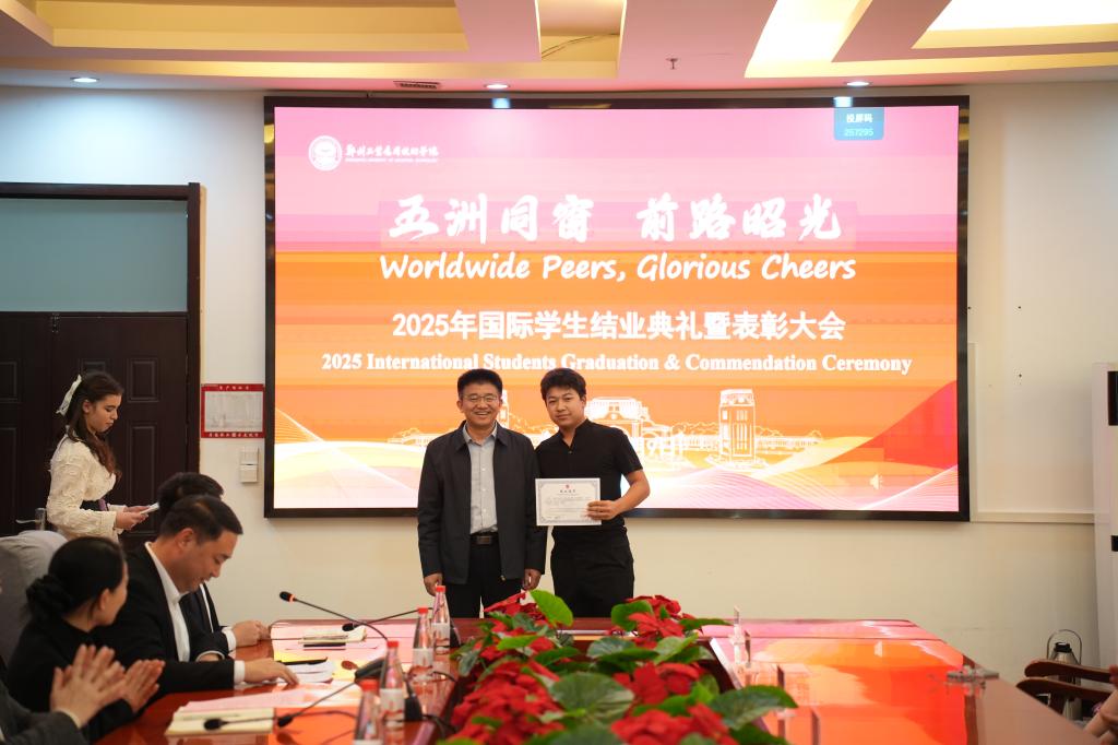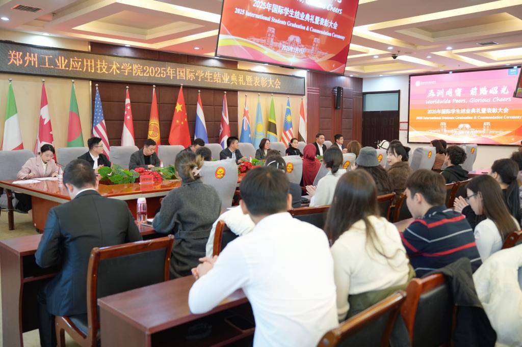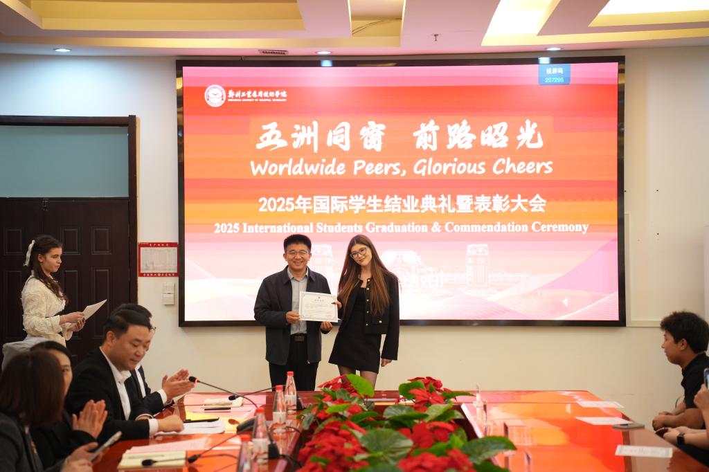 (文/任梦阳 图/刘婷)1月9日,我校2025年国际学生结业典礼暨表彰大会在行政管理中心二楼会议室举行。校长闫兵,党委副书记、副校长王美英,副校长贾圣强出席,学生工作部、教务处、国际教育学院等有关单位负责人及全体师生参加。国际教育学院院长郑晓航主持典礼。