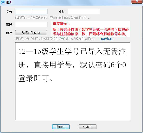 用户首次登陆系统或首次使用时,需要注册大学云客户端账号。打开客户端登录窗口,点击【注册用户】按钮,如图所示,打开“注册”窗口。信息填写完成后,点击【注册】按钮,账号审核通过后方可使用。